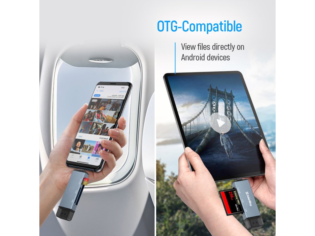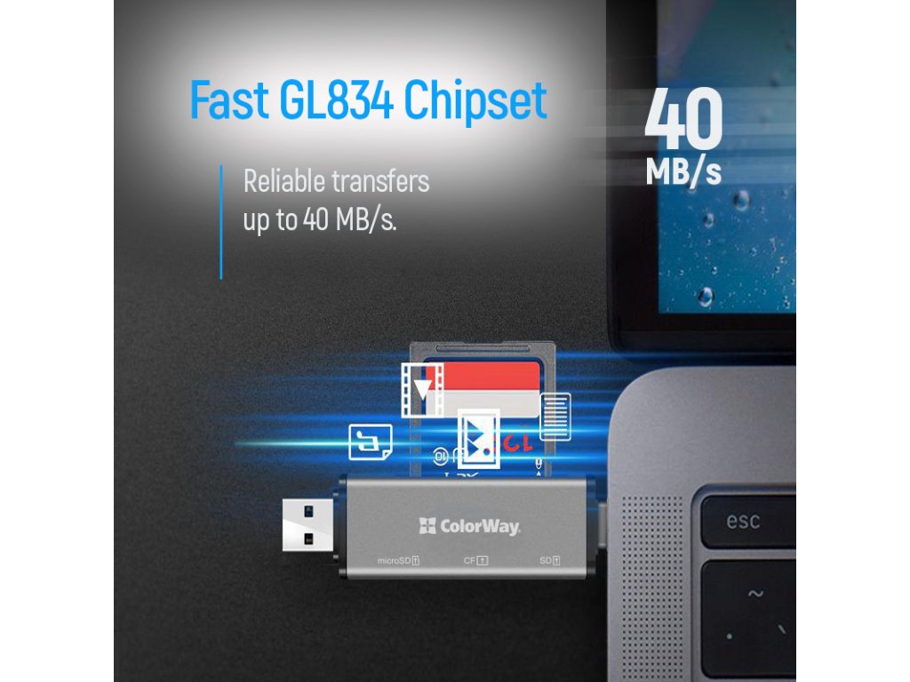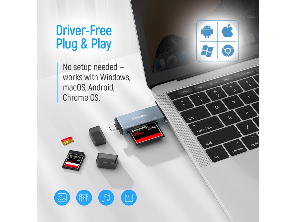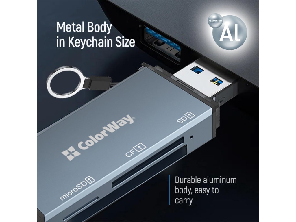 Praktická a štýlová čítačka kariet ColorWay 3-v-1 s podporou pamäťových kariet až do 2 TB je ideálnym riešením pre fotografov, kameramanov a všetkých, ktorí pracujú s veľkým objemom dát. Vďaka dvom konektorom — USB-C a USB-A — ju ľahko pripojíte k notebookom, PC, tabletom či smartfónom s podporou OTG. Spoľahlivý čipset GL834 zaručuje stabilný prenos dát a odolné kovové telo s príveskom z nej robí skvelého spoločníka na cesty.