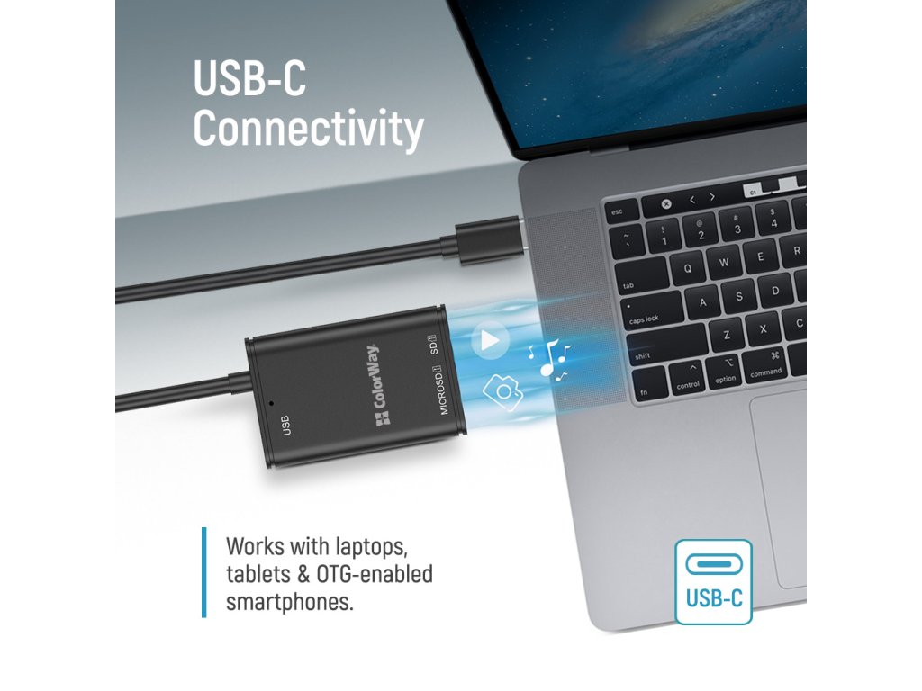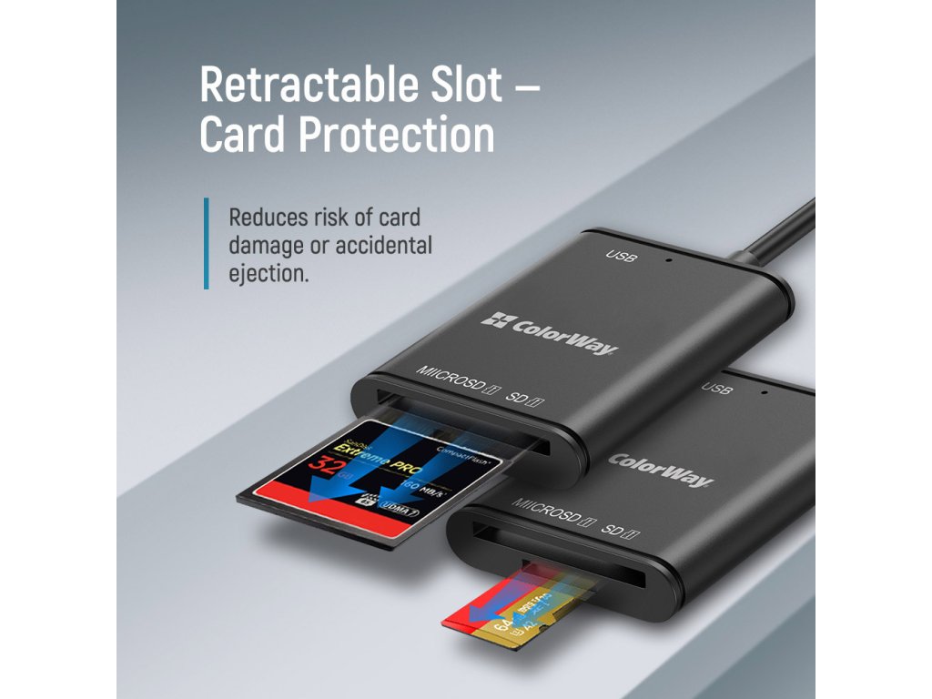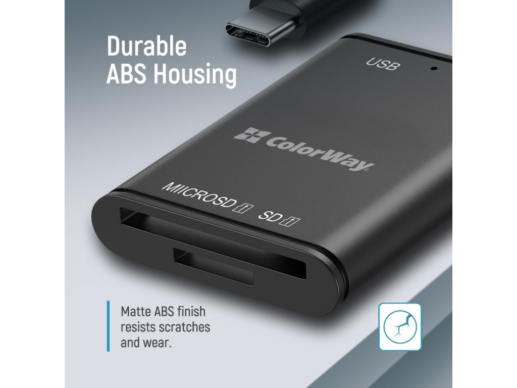 Kompaktná čítačka kariet ColorWay USB-C je určená na prácu so SD a microSD (TF) kartami a zároveň ponúka USB-A 3.0 port s rýchlosťou prenosu dát až 5 Gbps. Umožňuje pohodlné pripojenie k notebookom, PC, tabletom a smartfónom s USB-C portom a podporou OTG. Vďaka výsuvnému slotu sú karty chránené pred náhodným vysunutím a malé rozmery umožňujú vziať si ju kamkoľvek.