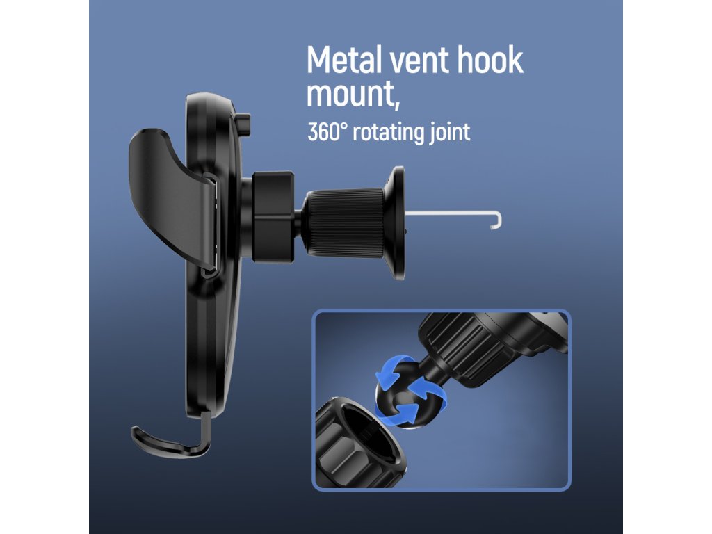 Jeho používanie je maximálne jednoduché: stlačením tlačidla sa ramená otvoria a po vložení telefónu ich stačí manuálne stlačiť k sebe, čím sa zariadenie bezpečne uzamkne. Kompaktný dizajn držiaka je ideálny na každodenné cesty a vďaka pevnému kovovému háku do ventilačnej mriežky zostáva držiak stabilný bez akýchkoľvek vibrácií či hluku.