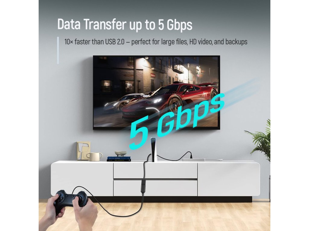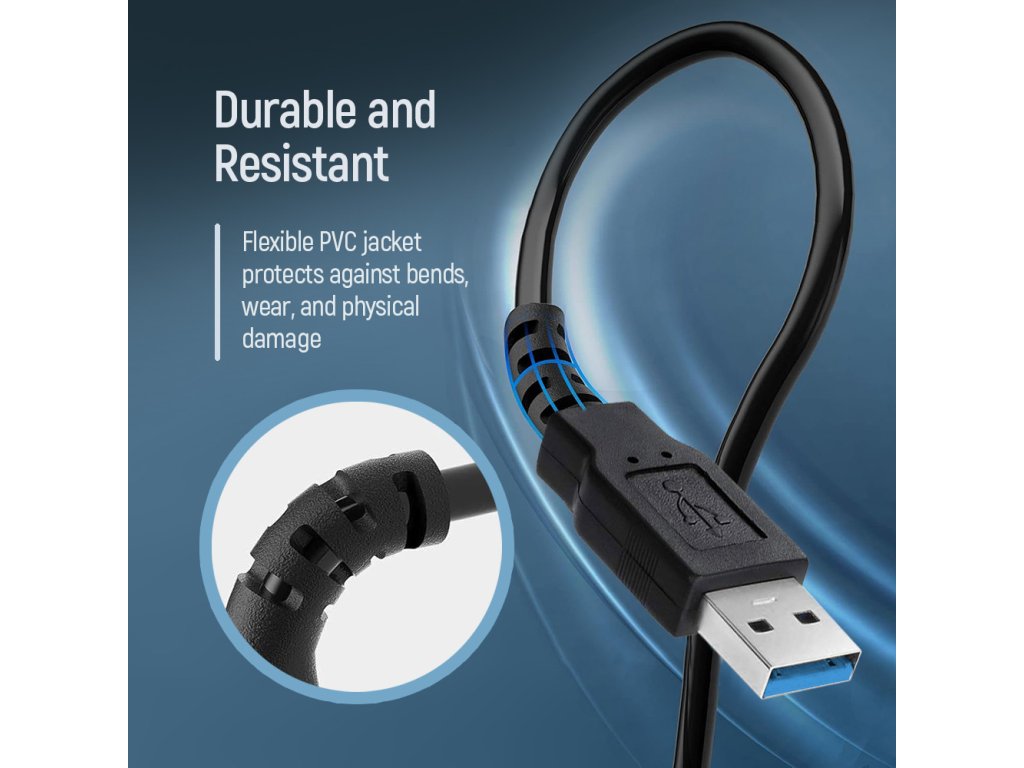 Podporuje vysokorýchlostný prenos dát až 5 Gbps (štandard USB 3.0) – to je až 10× rýchlejšie než USB 2.0. Vďaka tomu zvládne rýchly prenos veľkých súborov, HD videa, audia a ďalších dát bez oneskorení. Medený vodič zaručuje stabilný signál a odolný PVC plášť chráni kábel pred poškodením, ohýbaním a opotrebovaním aj pri častom používaní.