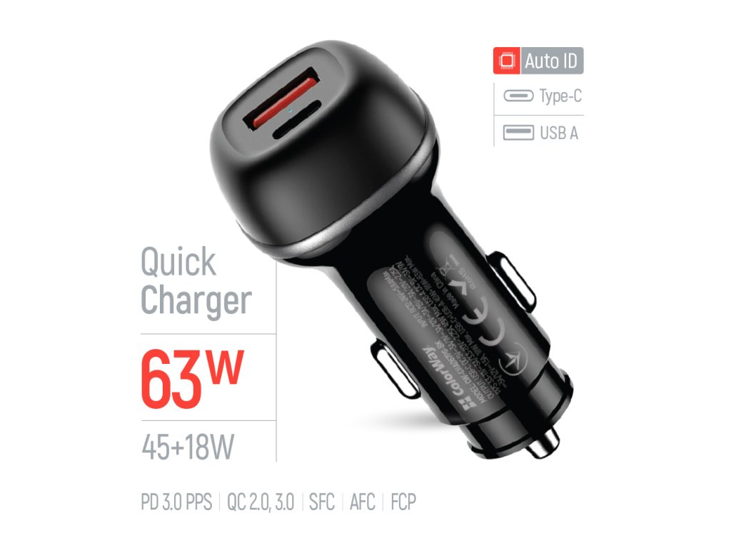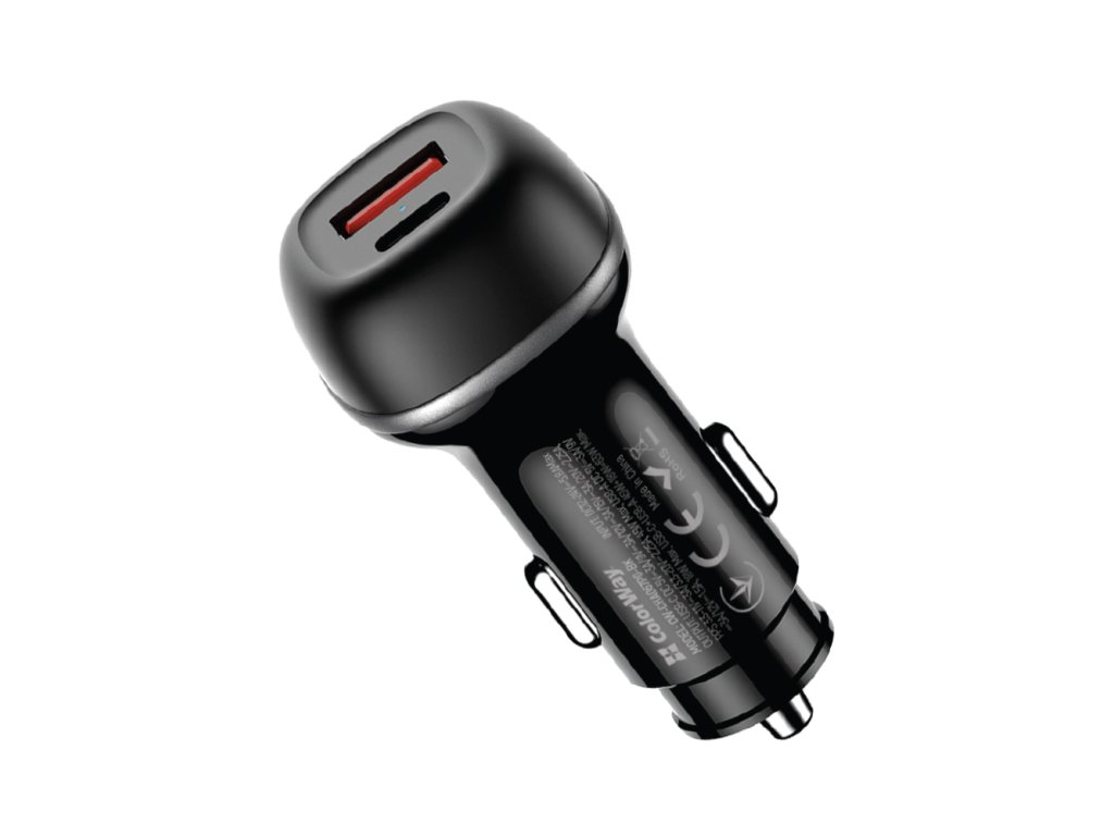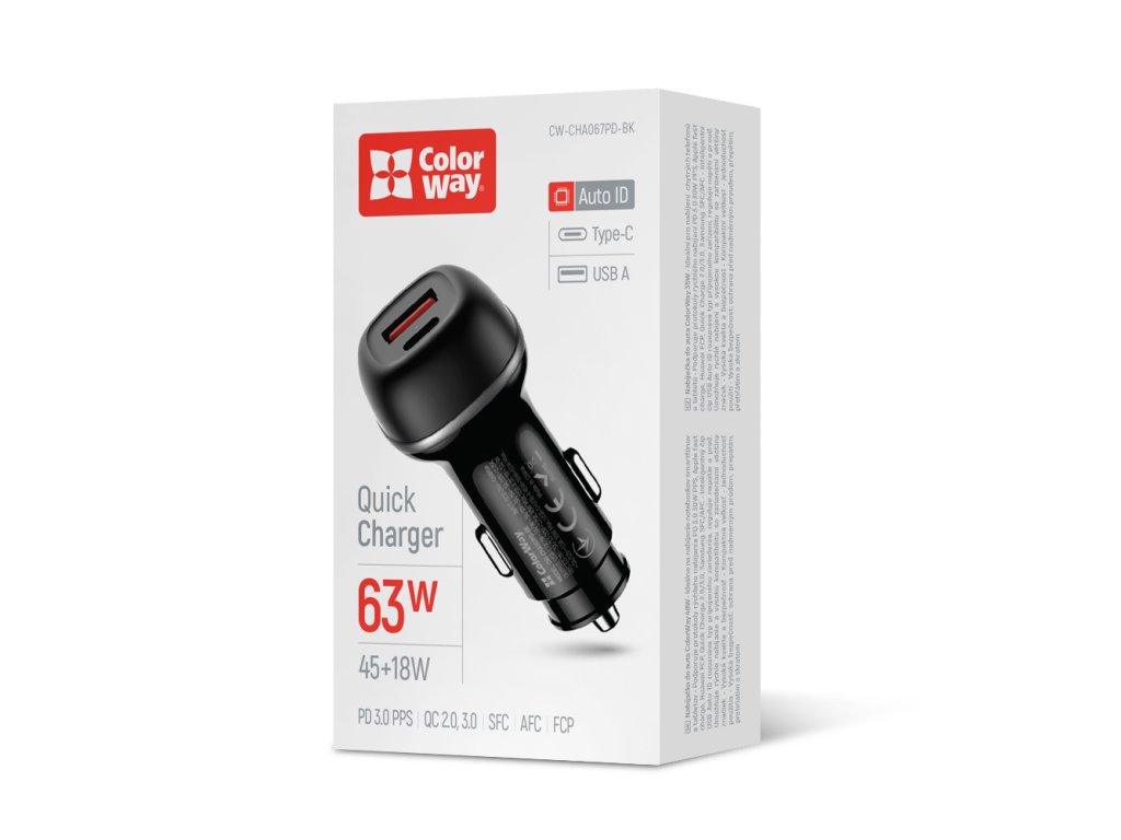 Autonabíjačka ColorWay s celkovým výkonom až 63 W predstavuje univerzálne riešenie pre rýchle nabíjanie moderných mobilných zariadení počas jazdy. Je vybavená USB-C portom s technológiou Power Delivery až 45 W a rozšírenými napäťovými profilmi (až do 20 V), doplneným o USB-A port s podporou Quick Charge do 18 W. Umožňuje tak súčasné nabíjanie dvoch zariadení bez straty účinnosti.