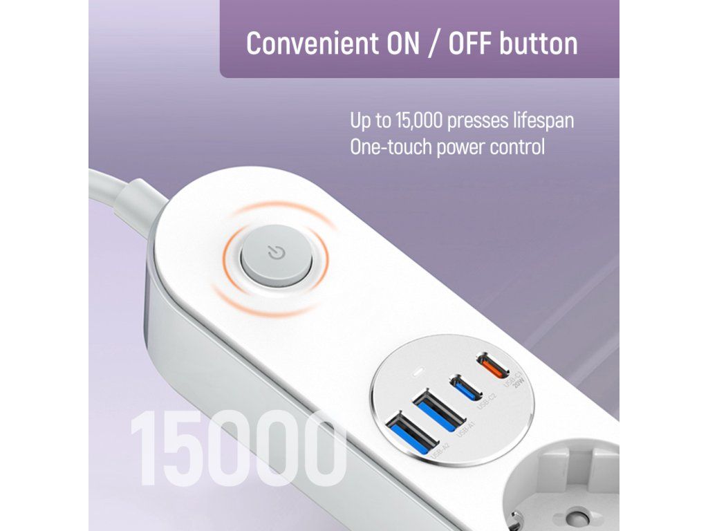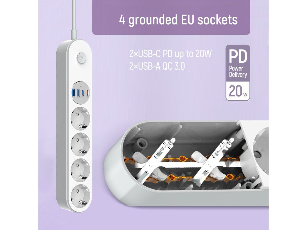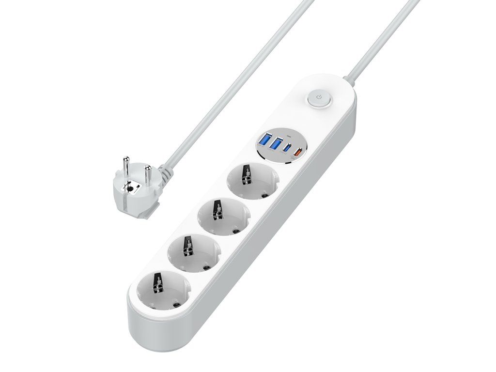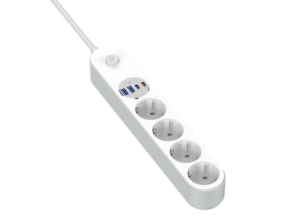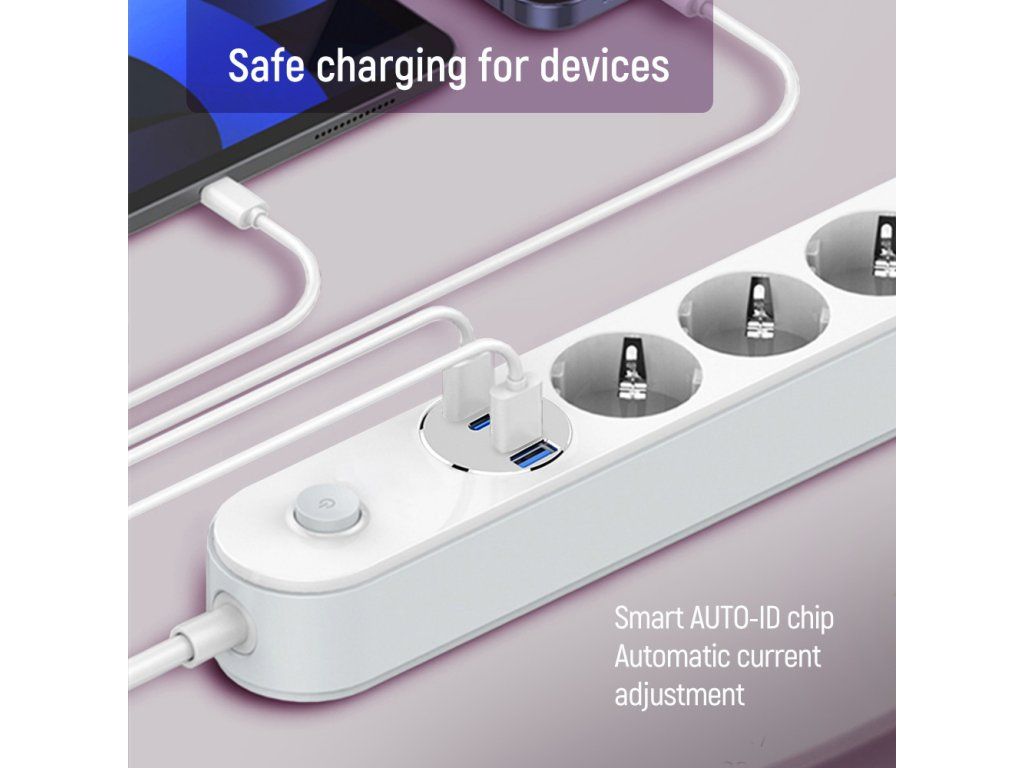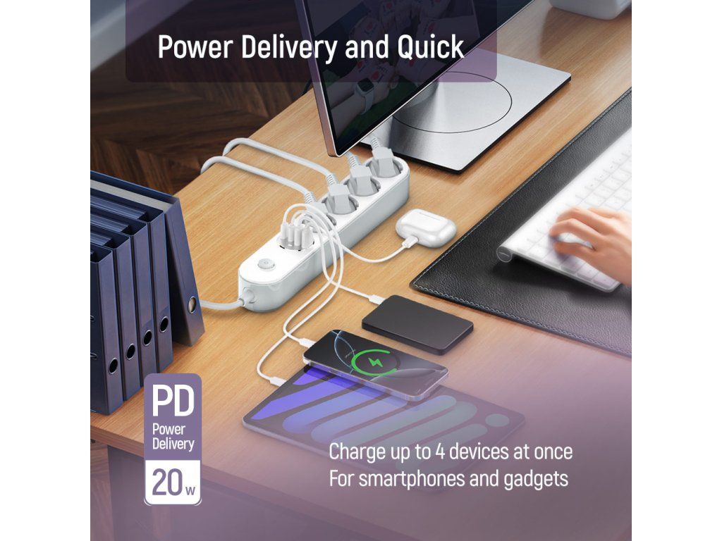 Štyri uzemnené zásuvky zabezpečujú stabilné napájanie, zatiaľ čo 4 USB porty (2× USB-C PD + 2× USB-A QC 3.0) umožňujú rýchle nabíjanie smartfónov, tabletov, slúchadiel a ďalších zariadení. Inteligentný AUTO-ID čip automaticky rozpozná pripojené zariadenie a nastaví optimálne nabíjacie parametre.