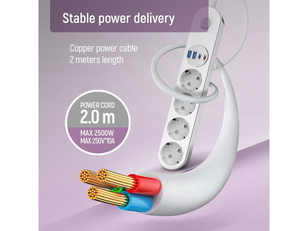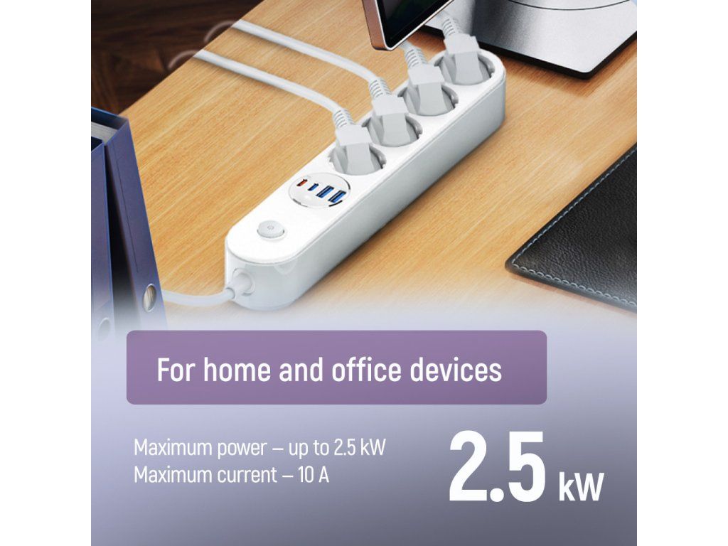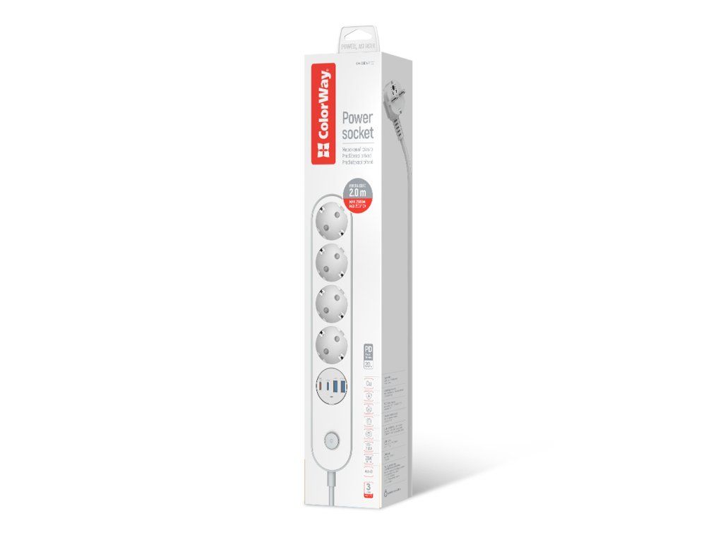 - Názov: Predlžovací kábel ColorWay 4 zásuvky / 4 USB (2× USB-C PD 20W + 2× USB-A QC 3.0), 2 m