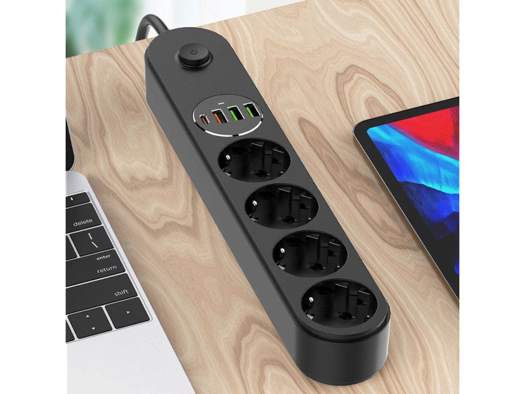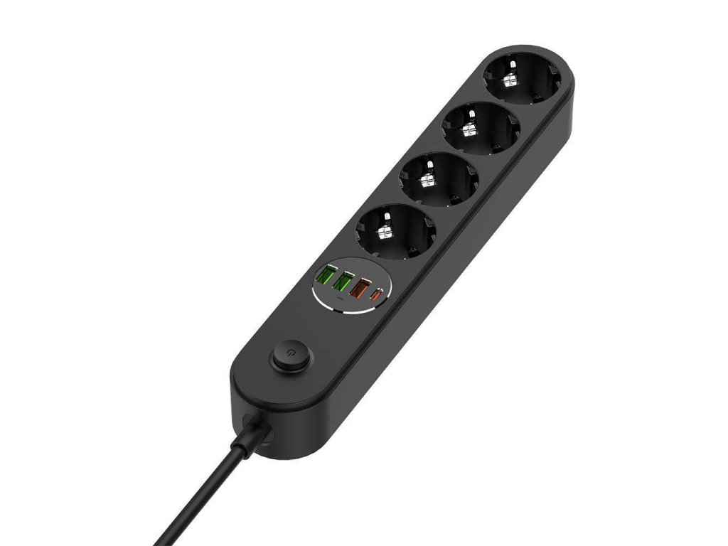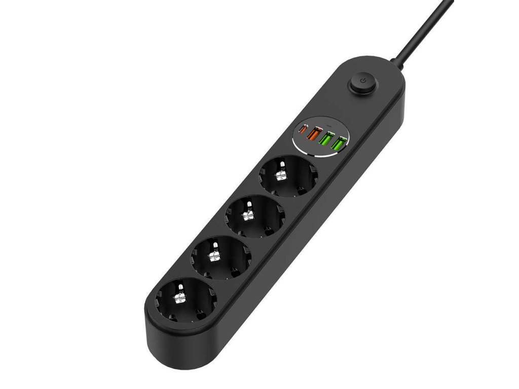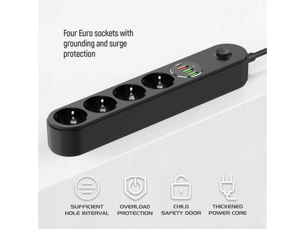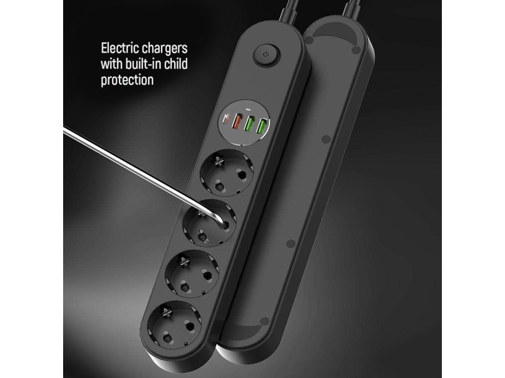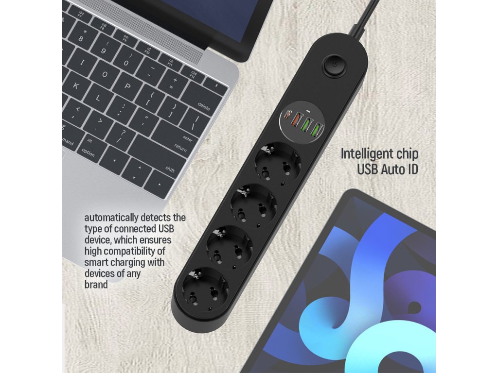 Predlžovací kábel so štyrmi 220V zásuvkami a štyrmi USB portami. Detské ochrana poskytuje bezpečnosť a automatické vyvažovanie záťaže rozdeľuje energiu medzi porty USB (spolu až 45 W). Tri porty USB podporujú rýchle nabíjanie Quick Charge 3.0 a štvrtý port USB-C je port PD s podporou rýchleho nabíjania Apple. Pohodlné tlačidlo zapnutia/vypnutia a LED indikácia uľahčia používanie. Tento predlžovací kábel umožňuje nielen pripojiť elektrospotrebiče, ale aj súčasne nabíjať až štyri mobilné zariadenia, ako sú smartfóny, tablety, externé batérie atď. Kontaktné skupiny zásuviek sú vyrobené z kvalitnej zliatiny medi, telo je vyrobené z ohňovzdorného plastu, odolného teplotám do 750°C. Predlžovací kábel má tiež uzemnenie, vďaka čomu je jeho používanie bezpečné.