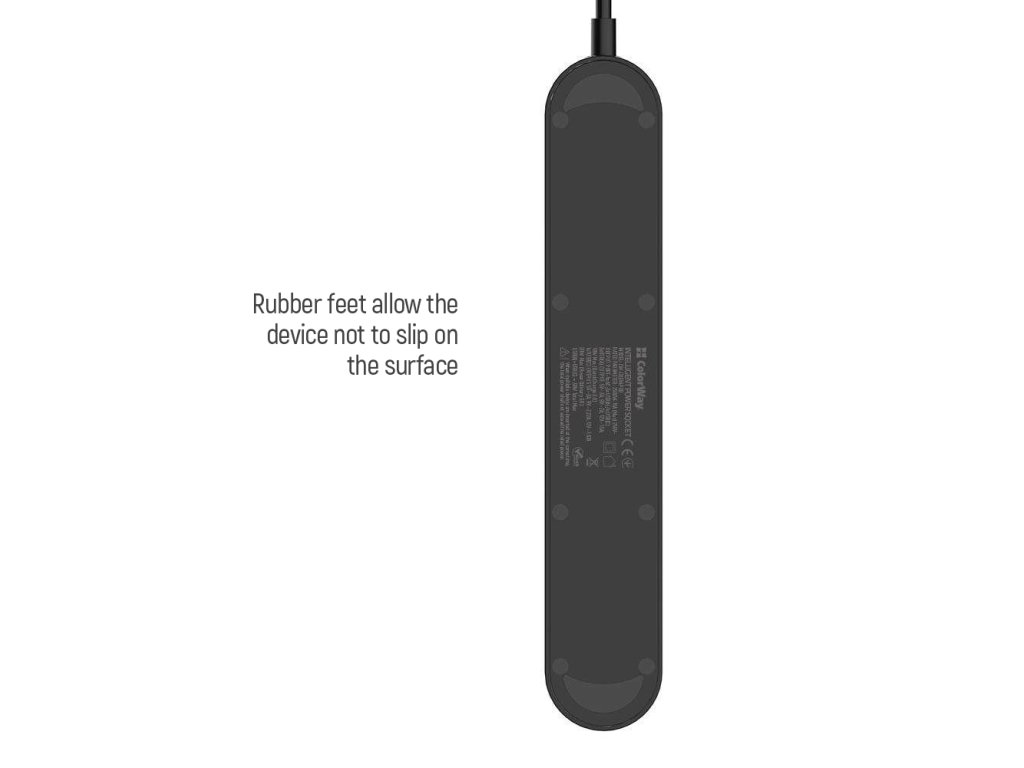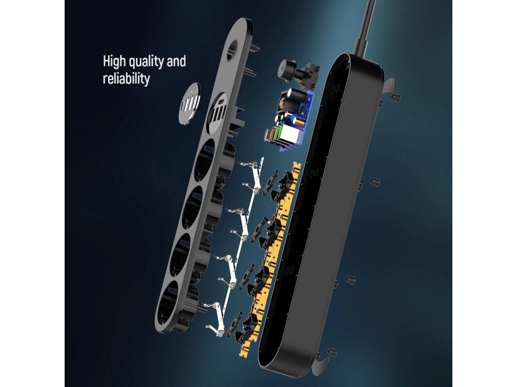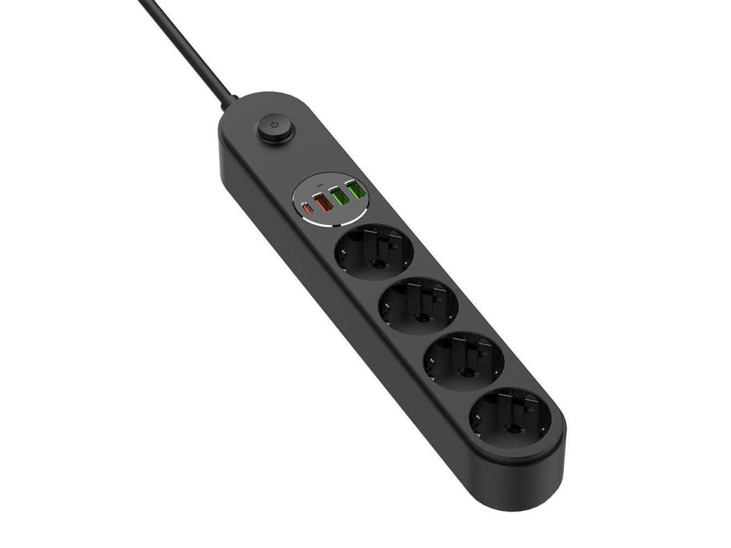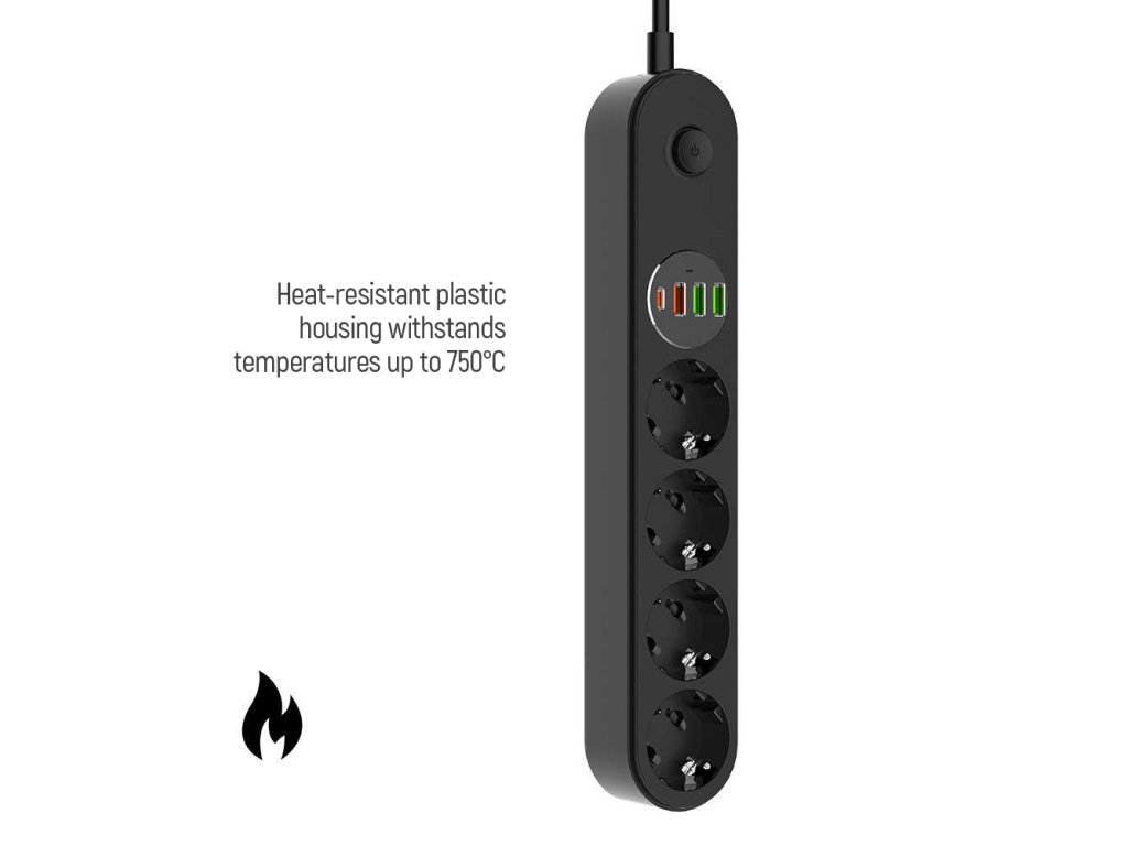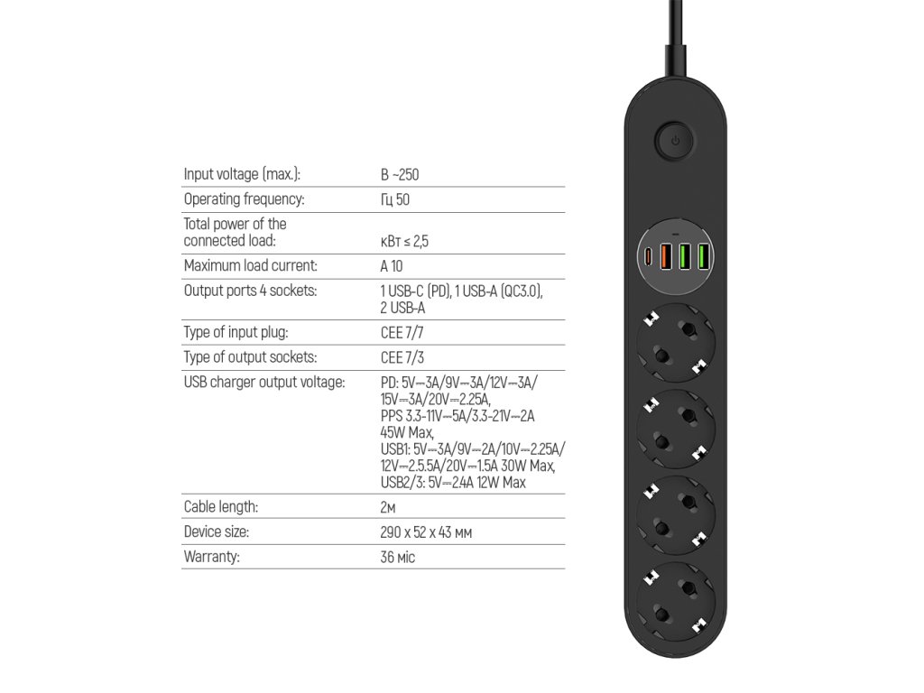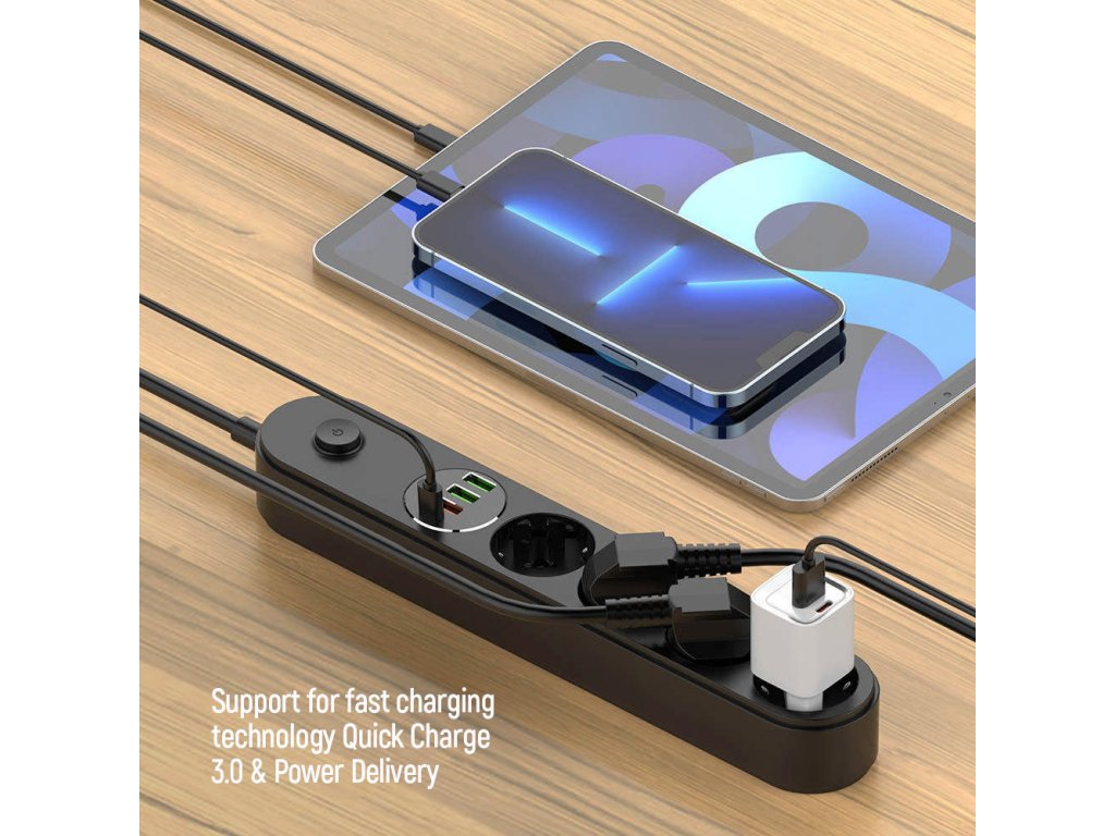 Predlžovací kábel so štyrmi 220V zásuvkami a štyrmi USB portami. Detské ochrana poskytuje bezpečnosť a automatické vyvažovanie záťaže rozdeľuje energiu medzi porty USB (spolu až 45 W). Tri porty USB podporujú rýchle nabíjanie Quick Charge 3.0 a štvrtý port USB-C je port PD s podporou rýchleho nabíjania Apple. Pohodlné tlačidlo zapnutia/vypnutia a LED indikácia uľahčia používanie. Tento predlžovací kábel umožňuje nielen pripojiť elektrospotrebiče, ale aj súčasne nabíjať až štyri mobilné zariadenia, ako sú smartfóny, tablety, externé batérie atď. Kontaktné skupiny zásuviek sú vyrobené z kvalitnej zliatiny medi, telo je vyrobené z ohňovzdorného plastu, odolného teplotám do 750°C. Predlžovací kábel má tiež uzemnenie, vďaka čomu je jeho používanie bezpečné.