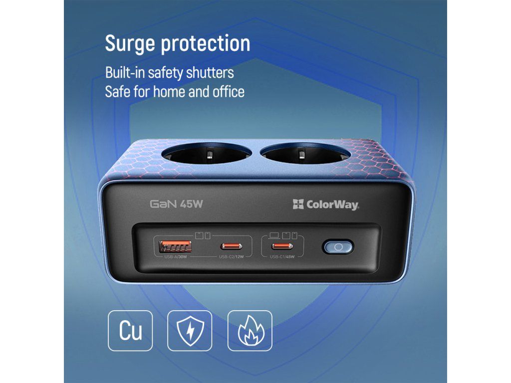 Predlžovací kábel ColorWay s prepäťovou ochranou 2× 230 V / 1× USB-A / 2× USB-C (GaN 45 W), modrý, 2 m (CW-CHE25PDB)
