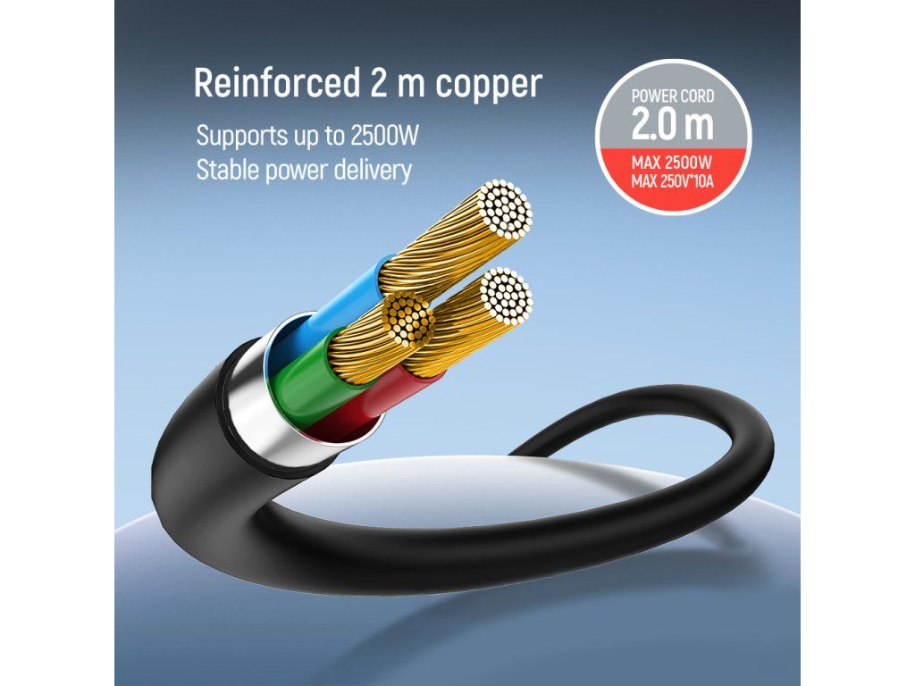 Zariadenie je vyrobené z nehorľavého plastu triedy V0, má prepäťovú ochranu, detské poistky a hlavný vypínač pre úplné odpojenie napájania. Zosilnený 2 m kábel zvládne zaťaženie až 2500 W, čo zaručuje bezpečné používanie aj pri výkonnejších zariadeniach.