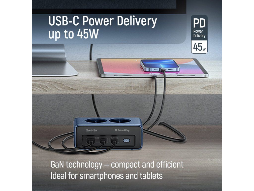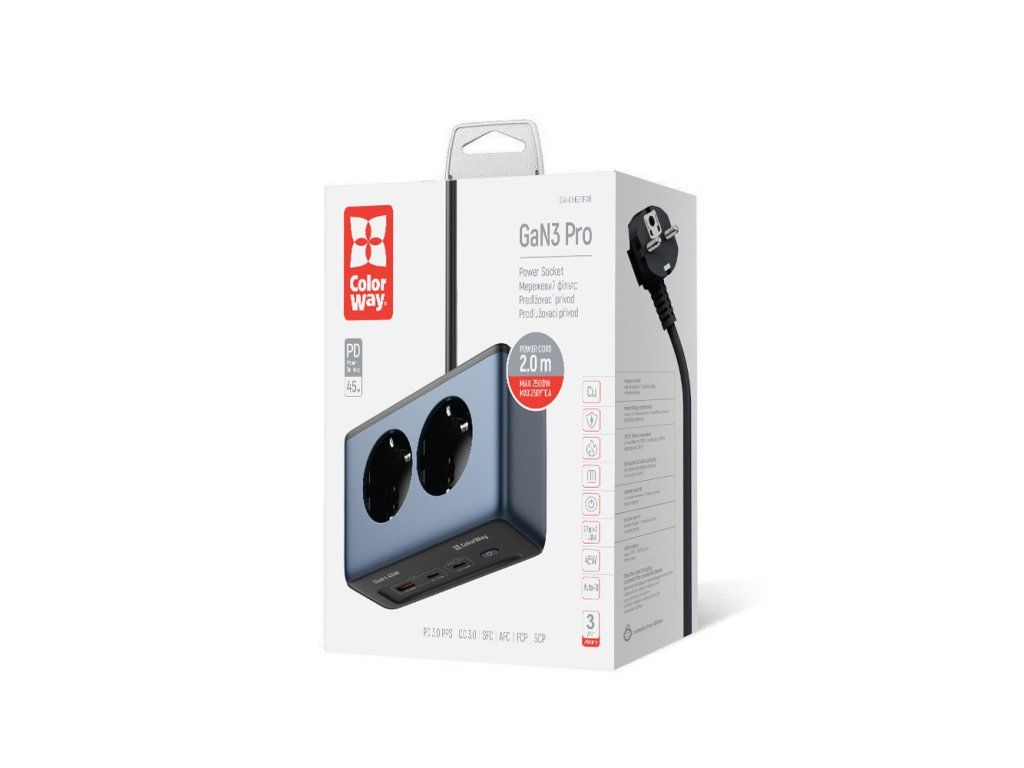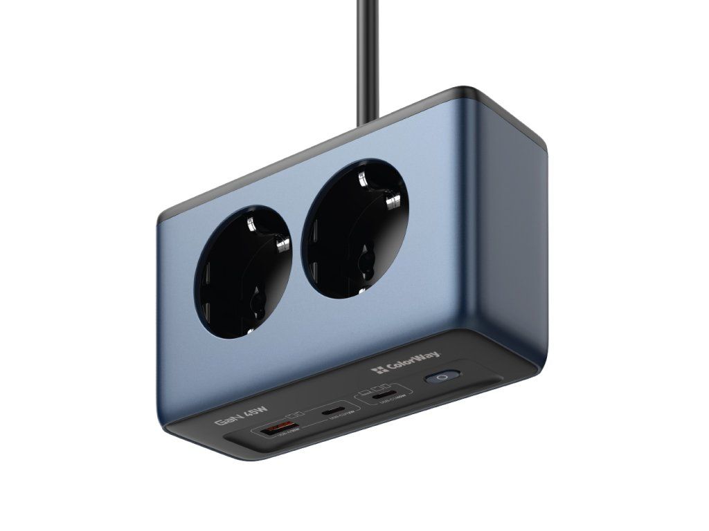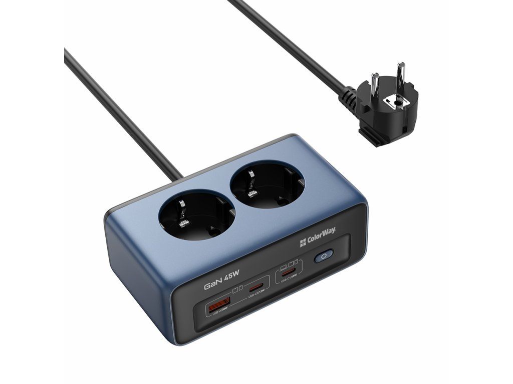 - Názov: Predlžovací kábel ColorWay 2× 230 V / 1× USB-A / 2× USB-C (GaN 45 W), 2 m