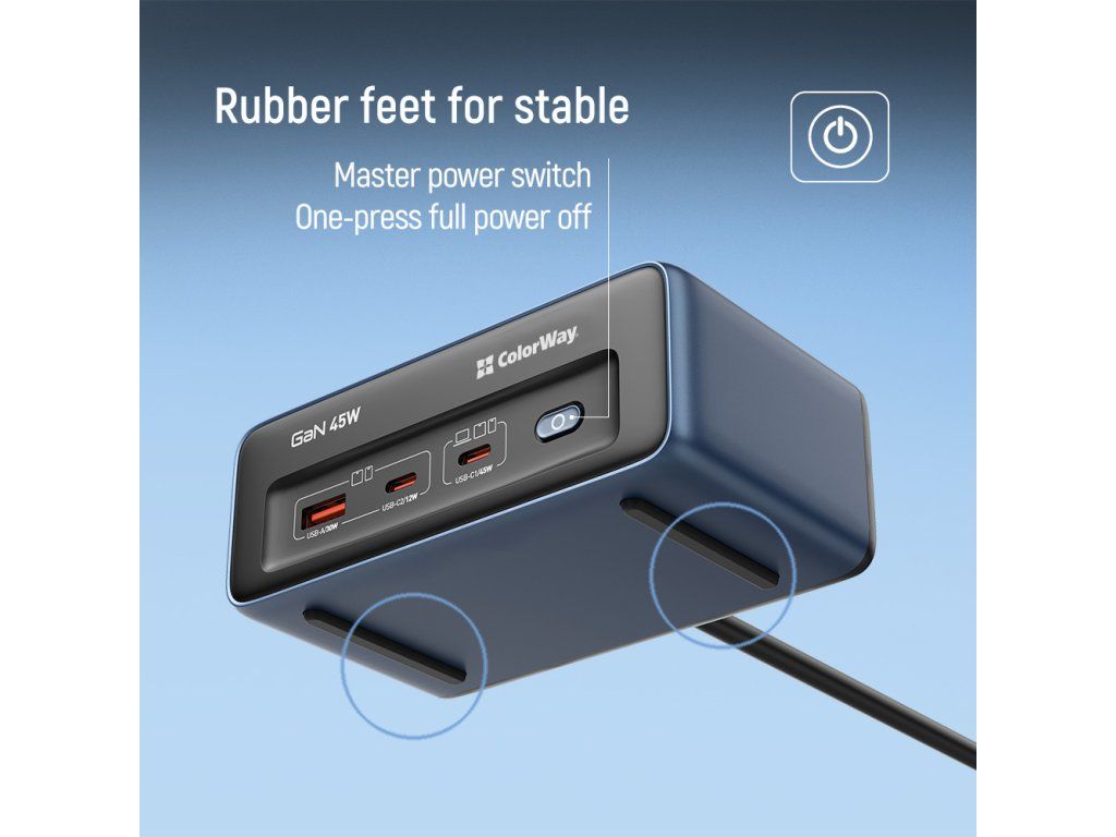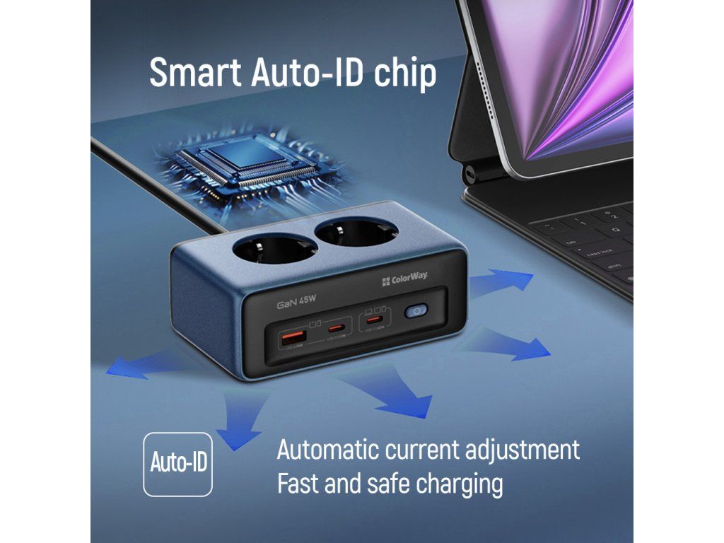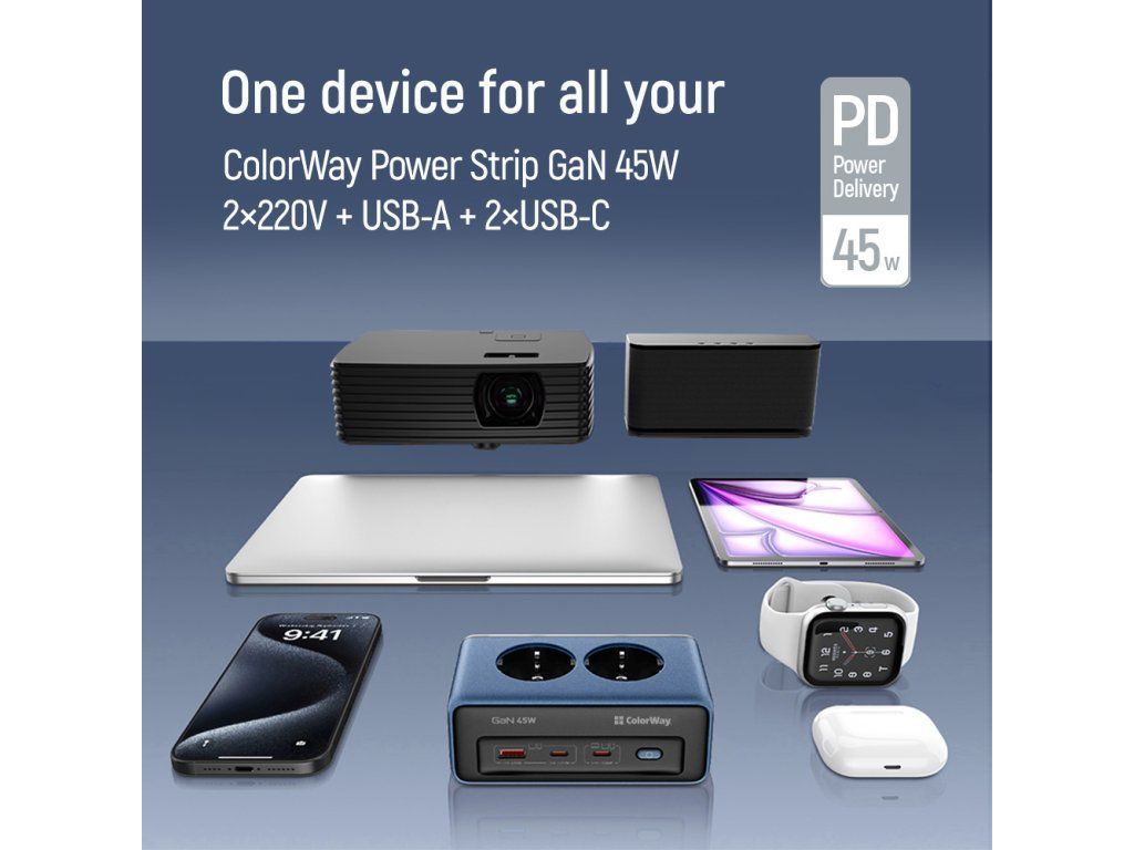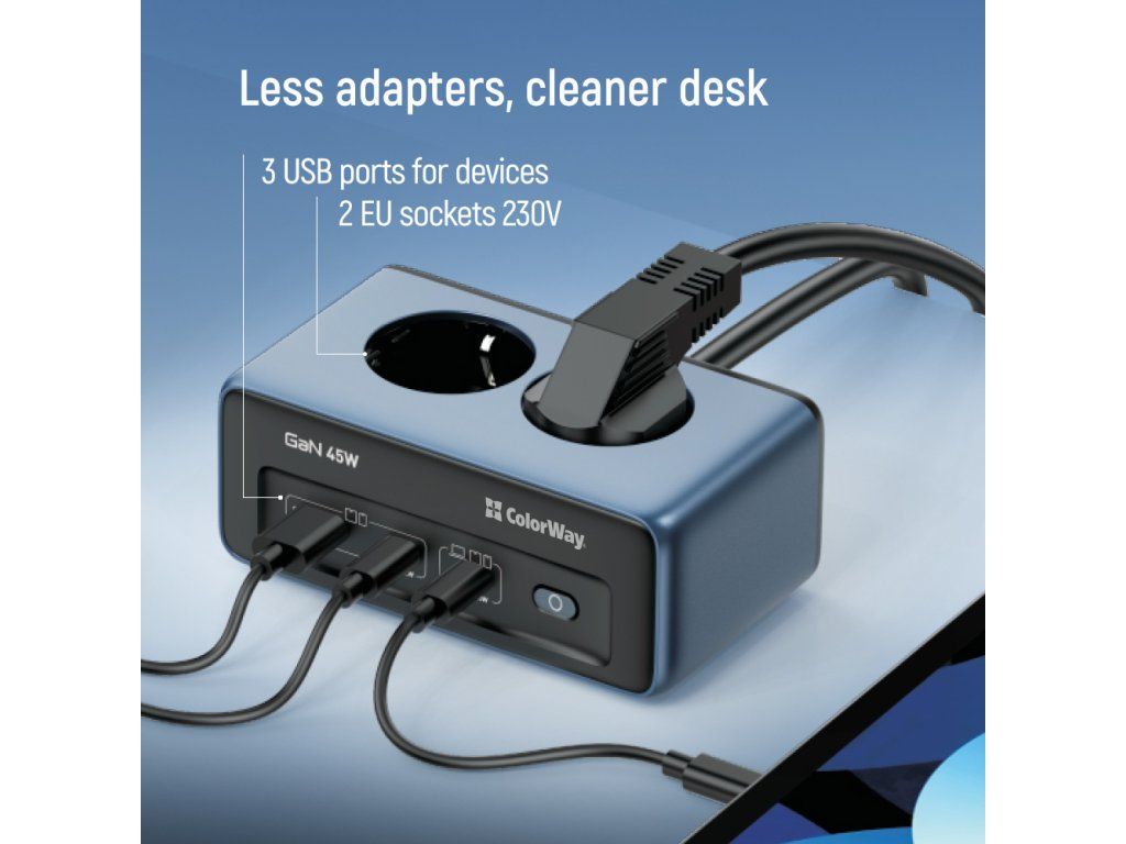 - Názov: Predlžovací kábel ColorWay 2× 230 V / 1× USB-A / 2× USB-C (GaN 45 W), 2 m