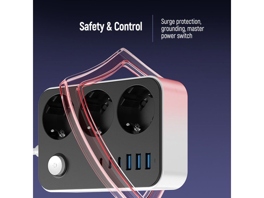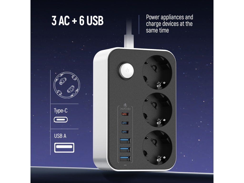 Moderný predlžovací kábel ColorWay novej generácie kombinuje 3 elektrické zásuvky a až 6 USB portov, vďaka čomu umožňuje súčasné napájanie a nabíjanie viacerých zariadení bez potreby ďalších adaptérov. Ideálny pre domácnosť aj kanceláriu – zvládne smartfóny, tablety, slúchadlá, powerbanky aj ďalšiu elektroniku.