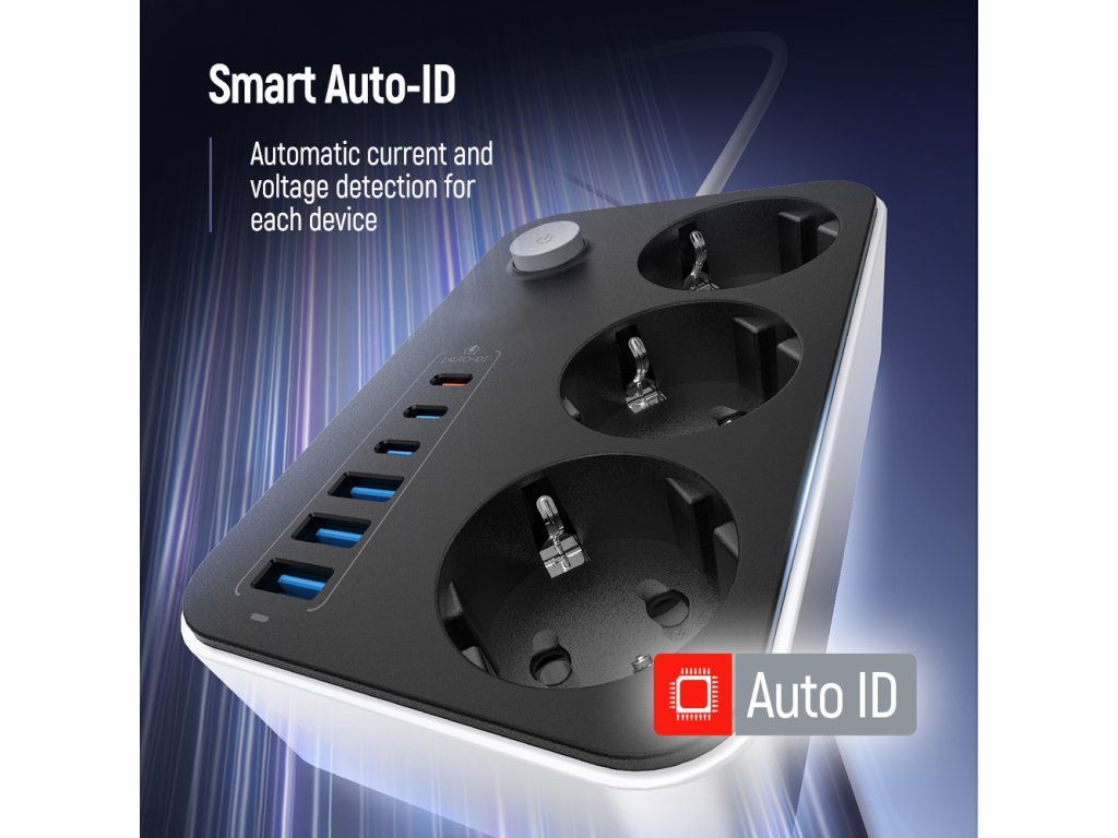 Podpora Power Delivery 2.0 / 3.0 a inteligentný systém riadenia výkonu zabezpečujú rýchle, stabilné a bezpečné nabíjanie. AUTO-ID čip automaticky rozpozná pripojené zariadenie a prispôsobí optimálne napätie a prúd. Celkový výkon USB výstupov je 20 W s inteligentným rozdelením výkonu pri súčasnom nabíjaní viacerých zariadení.
