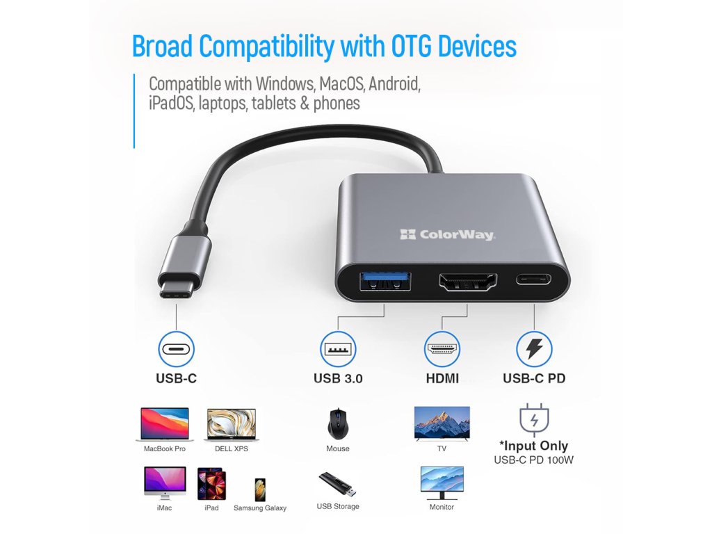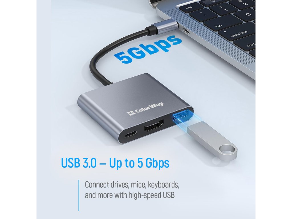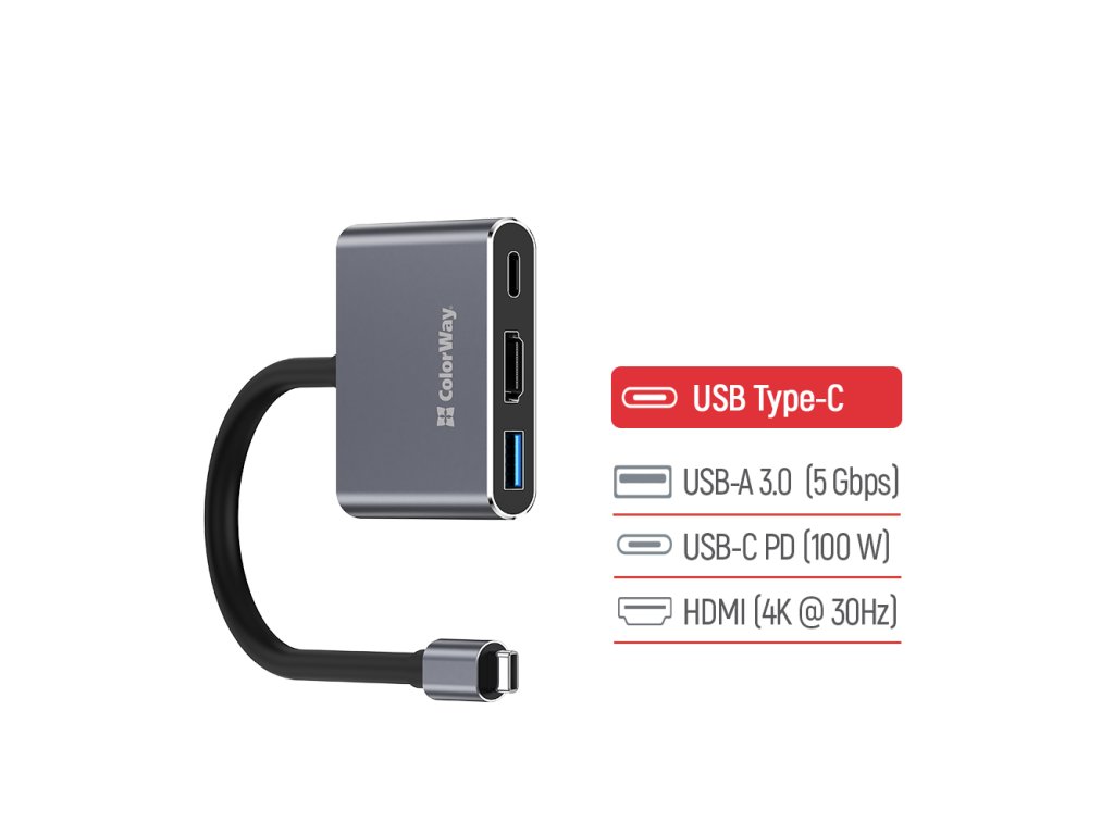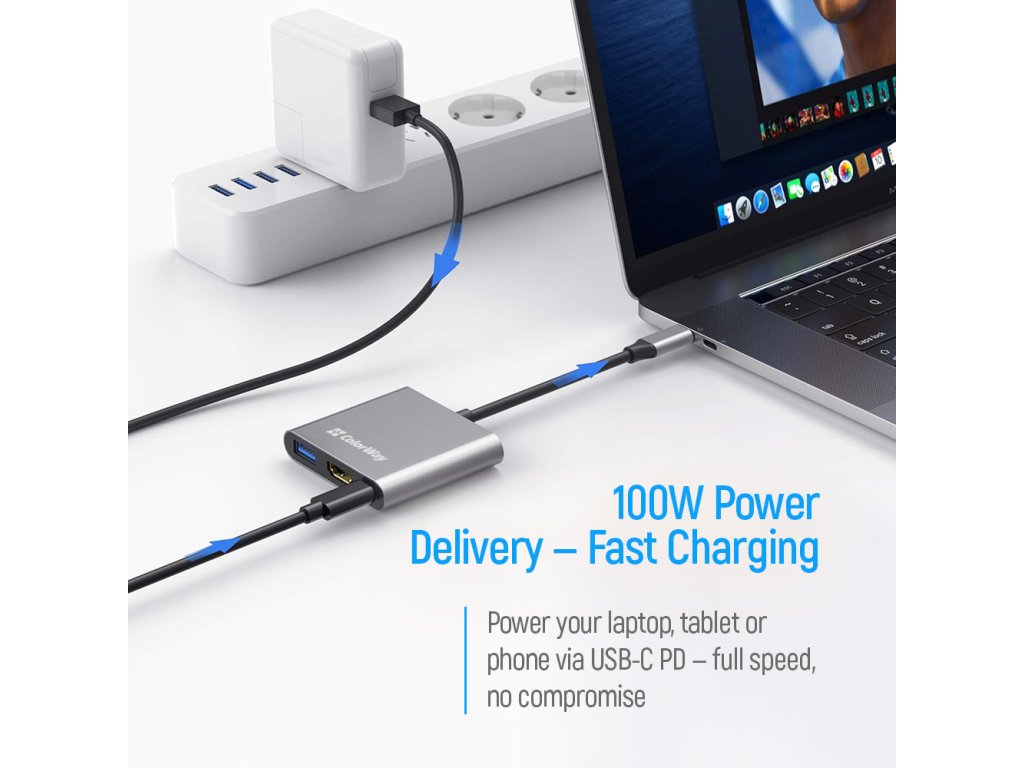USB Hub (Dokovacia stanica) ColorWay 3-v-1 USB-C PD 100W / USB 3.0 / HDMI 4K (CW-HUB08)