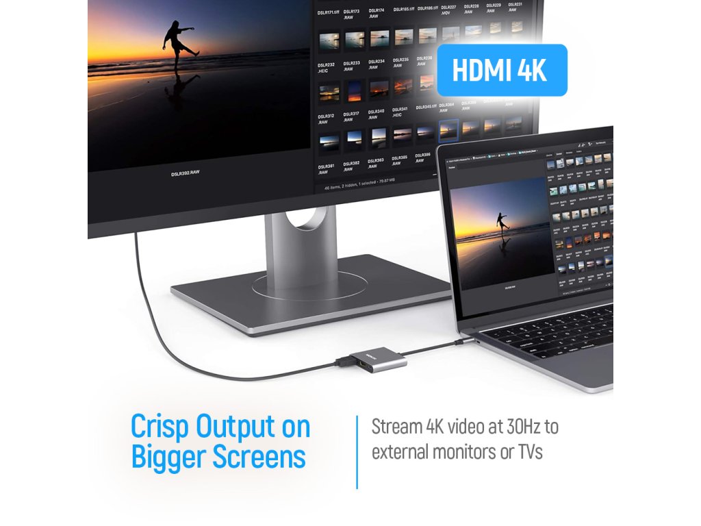 Výstupné porty: 1 × USB-C PD (do 100 W), 1 × HDMI (4K @ 30Hz), 1 × USB-A 3.0 (do 5 Gbps)